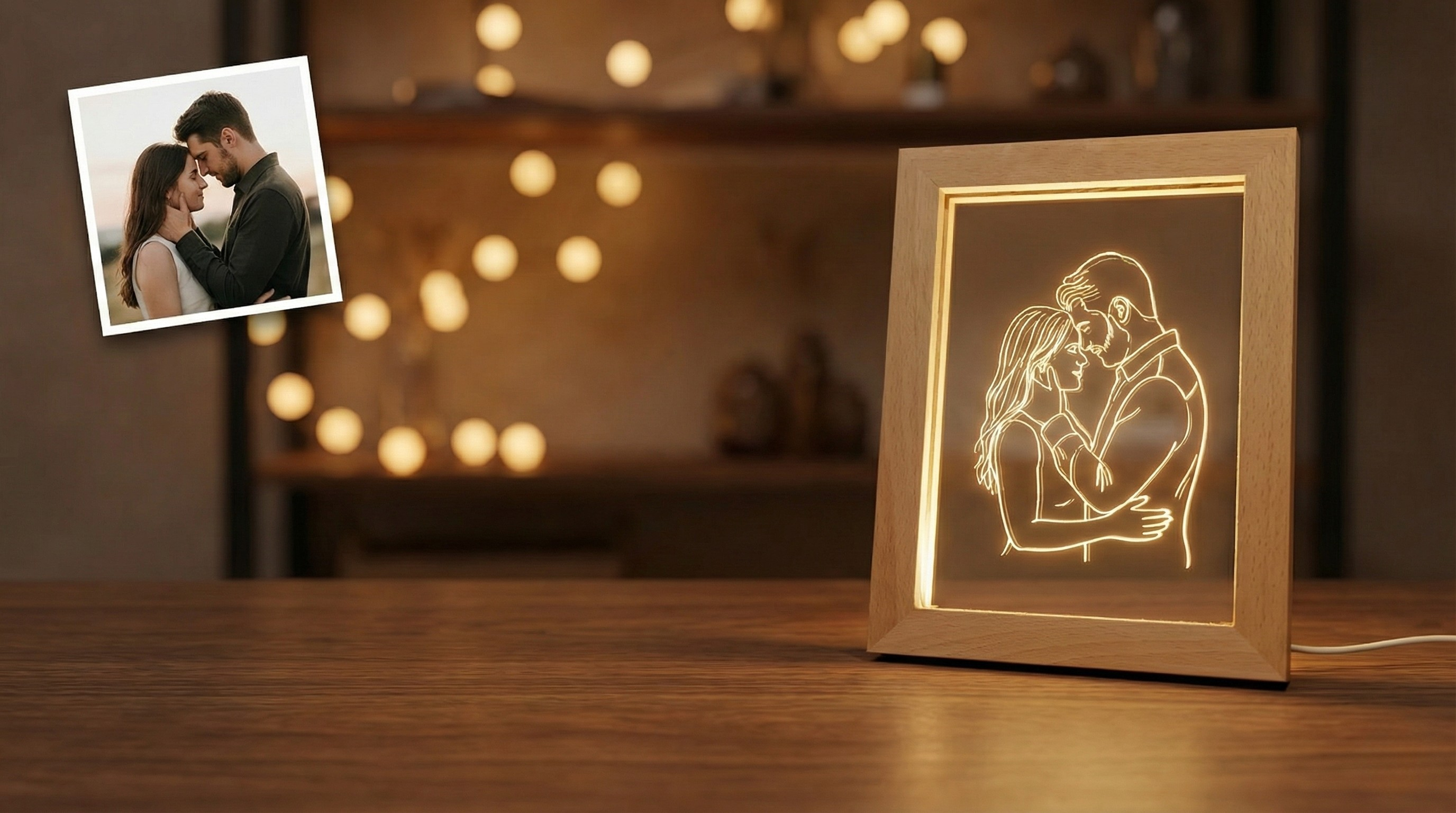 Verwandle ein Lieblingsfoto in ein sanft leuchtendes Erinnerungsstück – klare Line Art, lasergraviert auf kristallklarem Acryl und in Massivholz eingefasst.