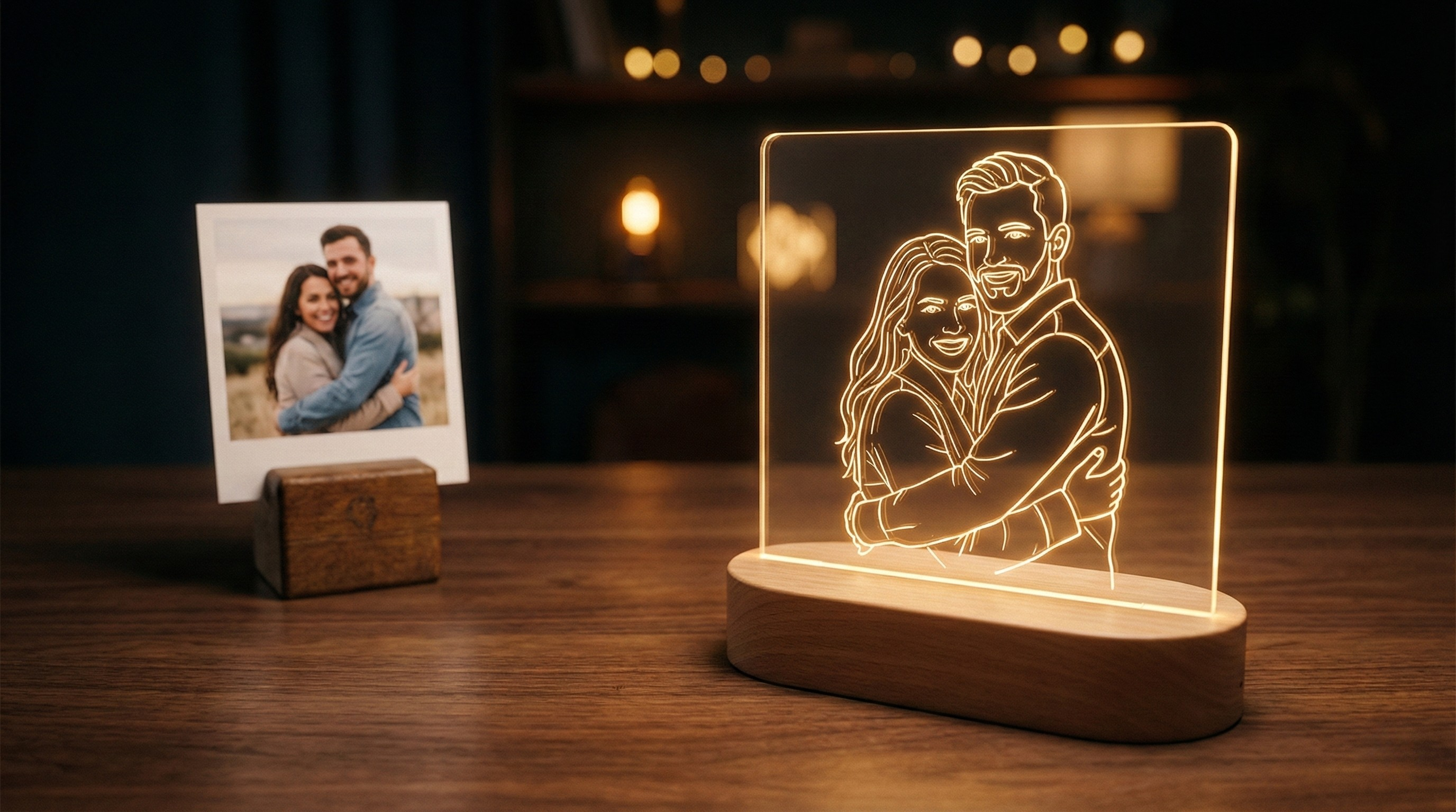 Turn your favourite photo into a softly glowing keepsake—laser-engraved on crystal-clear acrylic and set in solid wood.